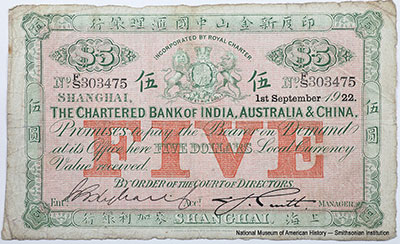 Chartered Bank of India, Australia, & China (行銀利加麥國中山金新度印) 5 dollars 1st September 1922.