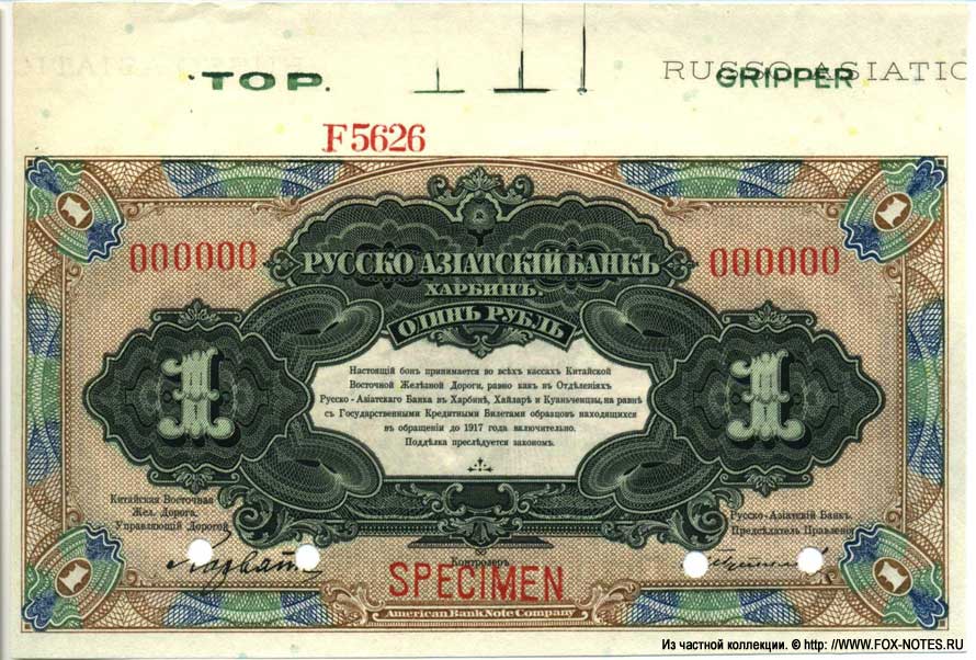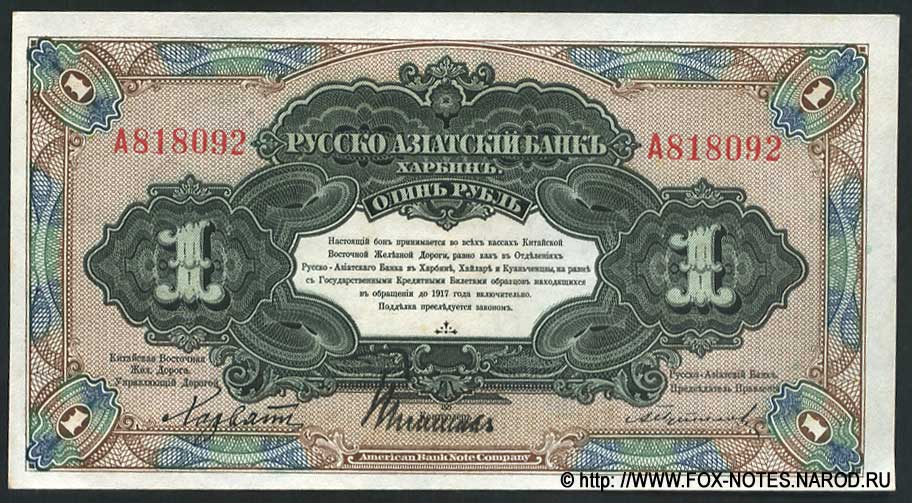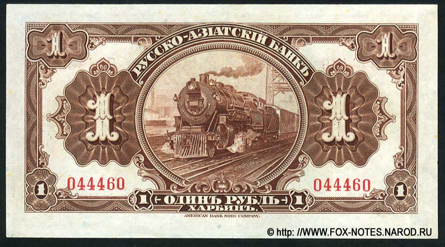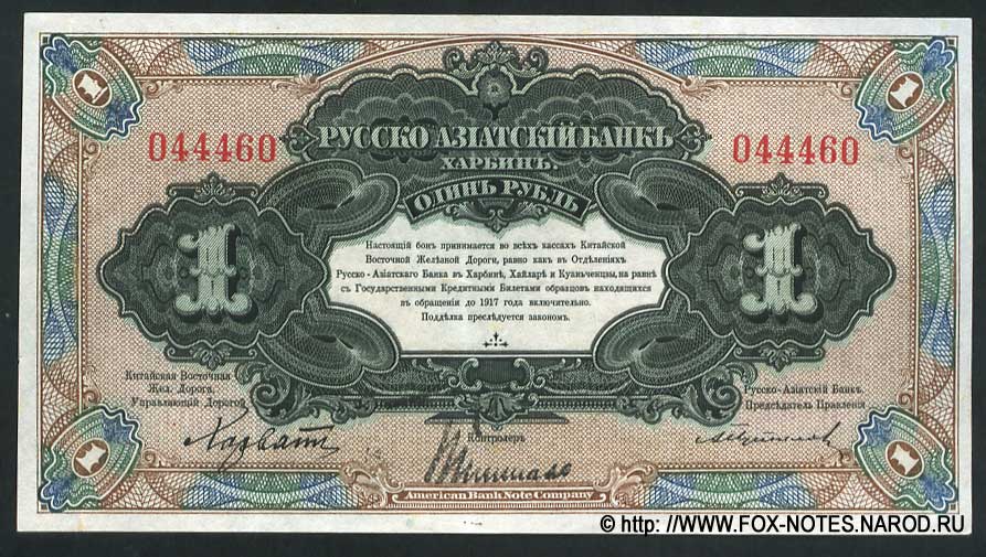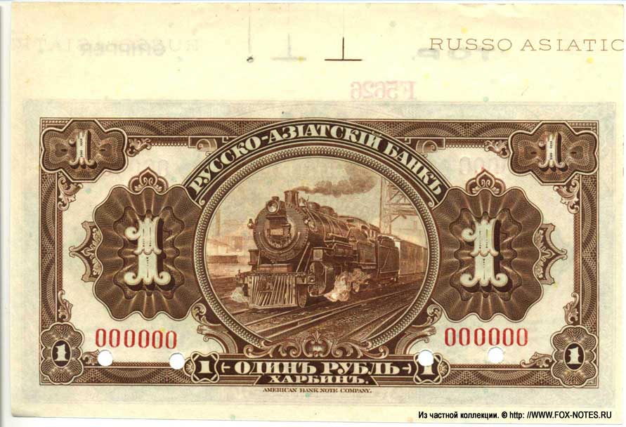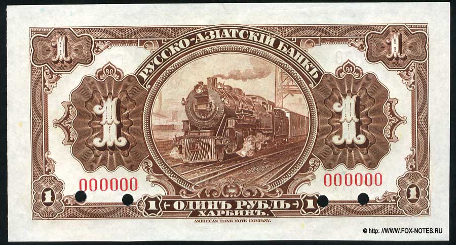 {SH2.0: §II. F-A/a} {§III} 1.1. Manufacturer: American Bank Note Company (ABNCO) 1.2. Signatures: Russian-Asian Bank: Chinese East Zhel. The road. Manager Dear D.L. Horvath, Russian-Asian Bank. Chairman of the Management Board A.I. Putilov. Controller I.K. Pimenov. All signatures are printed. 1.3. Numbering: 123456 - The serial number is printed twice on the front and twice on the back. No series. The number is six digits, red. A123456 - The serial number is printed twice on the front and twice on the back. Single-letter series. The number is six digits, red. 1.4. Size: 146 x 81 mm. 1.5. Paper/watermark type: dense paper without watermarks. 1.6. Sign design elements: The main image of the front side : A composition of multi-color guilloches with nominal numbers. Text: RUSSIAN-ASIAN BANK. ONE RUBLE. HARBIN. This bon is accepted at all ticket offices of the Sino-Eastern Railway, as well as at the branches of the Russian-Asian Bank in Harbin, Hailar and Kuanchenzi, along with state credit tickets of samples in circulation until 1917 inclusive. Counterfeiting is prosecuted. Sino-Eastern Railway. Managing the road. Russian-Asian Bank. Chairman of the Management Board. Controller. AMERICAN BANK NOTE COMPANY. The main image of the reverse side: In the center is a round guilloche with a steam locomotive. Frame made of guilloches with nominal numbers . Text: RUSSIAN-ASIAN BANK. ONE RUBLE. HARBIN. AMERICAN BANK NOTE COMPANY. Predominant colors: Hp black, brown, blue, green pattern. O.S. pattern is brown. 1.7. Author (s) of the sign design: not known. 1.8. Sample types: SPECIMEN Type 1. Sample with signatures of officials, without the signature of the controller. Number 000000. Original paper. Bilateral. SPECIES overprint. Punch holes by captions. 3.1. Kardakov N.I. Katalog der Geldscheine von Russland und Baltischen Staaten 1769-1950. Catalog of banknotes of both Russia and the Baltic countries 1769-1950. N. Kardakoff, Berlin 1951 г. 3.3. Kuznetsov A.Yu., Paramonov O.V. Paper money of Russian China. 2023 {Catalog code - "K-P "} 3.4. Istomin M.I. Banknotes of "Russian China" Publishing house Ivanchenko I.S., Kharkov 2014 3.5. Standard Catalog of World Paper Money, Specialized Issues. Krause Publications; Twelfth Edition (12) (18. Dezember 2013) 3.6. Pogrebetsky A.I. Money circulation and banknotes of the Far East for the period of war and revolution (1914-1924). - Harbin: On the study of Manchuria. edges; Chita; Dalnevost.-Sibir. Island "Book. case," 1924. - X, 419 p.