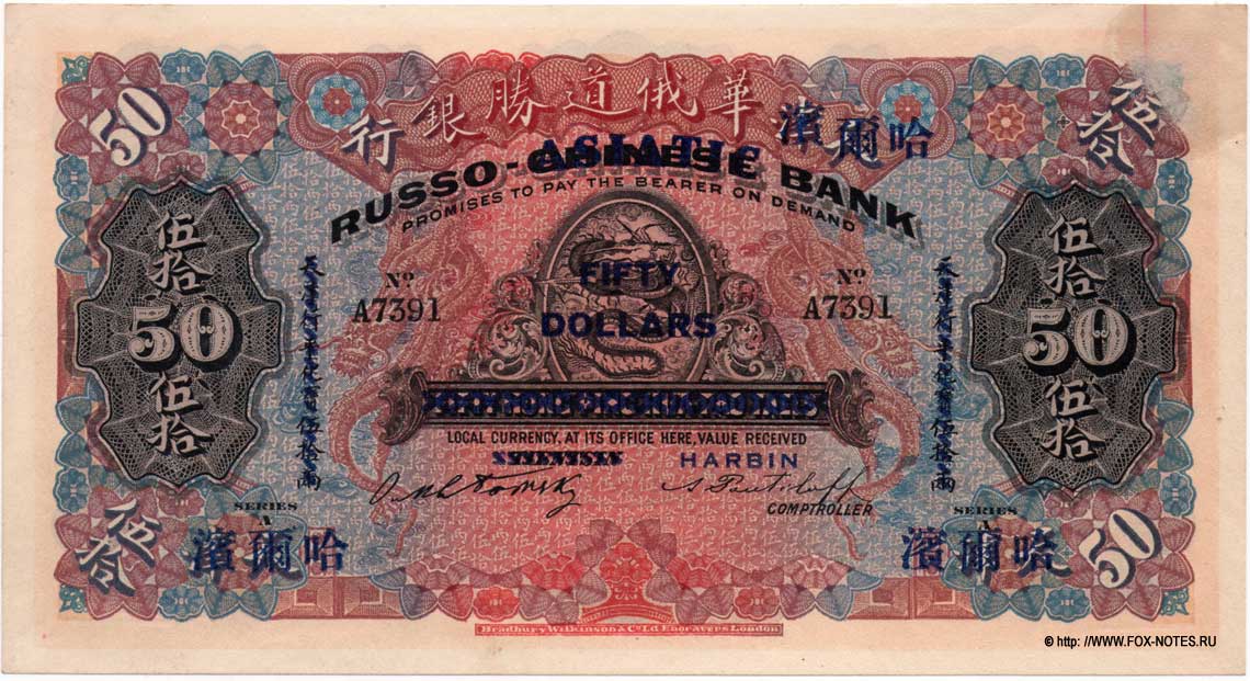 {SH2.0: §II. F-A/a} {§III} 1.1. Manufacturer (printer): Bradbury Wilkinson & CoLd London. 1.2. Signatures: RUSSO-CHINESE BANK: E. Ukhtomsky, A. Puturov, Controller/Controller B.M. Popov. The controller's signature is handwritten. 1.3. Numbering: SERIES A No. A1234 - The serial number is printed twice on the front. Single-letter series. The number is four digits, black . 1.4. Size: 191 x 101 mm. 1.5. Paper/watermark type: not known. 1.6. Sign design elements: Main image of the front side : Medallion in the center with a dragon. Ornament of multi-colored guilloches and dragons. Text in English and Chinese. Text: RUSSO-ASIATIC BANK The main image of the reverse side: A medallion in the center with the building of the Russian-Chinese Bank. Ornament of multi-colored guilloches and dragons. Chinese language text. Predominant colors: L.S. and o.s. multicolor - black, pink, blue. 1.7. Author (s) of the sign design: not known. 1.8. Sample types: Samples are not known. 3.1. Istomin M.I. Banknotes of "Russian China" Publishing house Ivanchenko I.S., Kharkov 2014 3.2. Kuznetsov A.Yu., Paramonov O.V. Paper money of Russian China. 2023 {Catalog code - "K-P "} 3.3. Standard Catalog of World Paper Money, Specialized Issues. Krause Publications; Twelfth Edition (12) (18. Dezember 2013)