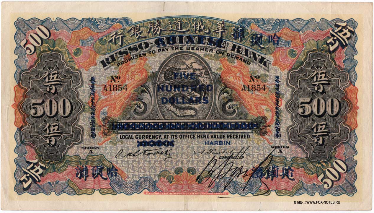 {SH2.0: §II. F-A/a} {§III} 1.1. Manufacturer (printer): Bradbury Wilkinson & CoLd London. 1.2. Signatures: RUSSO-CHINESE BANK: E. Ukhtomsky, A. Puturov, Controller/Controller B.M. Popov. The controller's signature is handwritten. 1.3. Numbering: SERIES A No. A1234 - The serial number is printed twice on the front. Single-letter series. The number is four digits, black . 1.4. Size: 213 x 120mm? 1.5. Paper/watermark type: not known. 1.6. Sign design elements: Main image of the front side : Medallion in the center with a dragon. Ornament of multi-colored guilloches and dragons. Text in English and Chinese. Text: RUSSO-ASIATIC BANK The main image of the reverse side: A medallion in the center with the building of the Russian-Chinese Bank. Ornament of multi-colored guilloches and dragons. Chinese language text. Predominant colors: L.S. and o.s. multicolor - brown, red, gray. 1.7. Author (s) of the sign design: not known. 1.8. Sample types: Samples are not known. 3.1. Istomin M.I. Banknotes of "Russian China" Publishing house Ivanchenko I.S., Kharkov 2014 3.2. Kuznetsov A.Yu., Paramonov O.V. Paper money of Russian China. 2023 {Catalog code - "K-P "} 3.3. Standard Catalog of World Paper Money, Specialized Issues. Krause Publications; Twelfth Edition (12) (18. Dezember 2013)