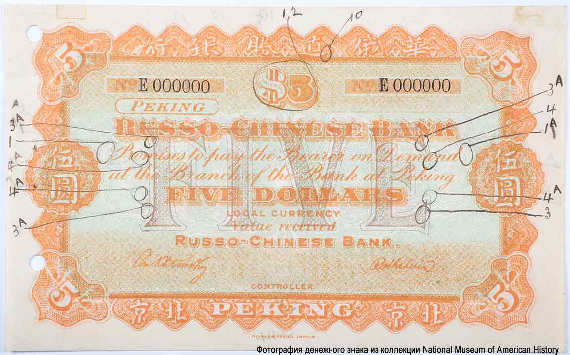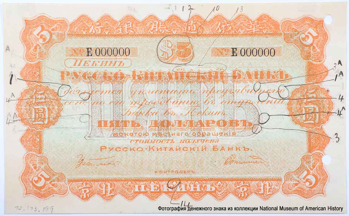 111111 Issues of Russian-Chinese Bank - Russian-Asian Bank. Paper Currency Directory = Russian-Chinese Bank. Beijing branch. $5 banknote in local currency 1903-222222