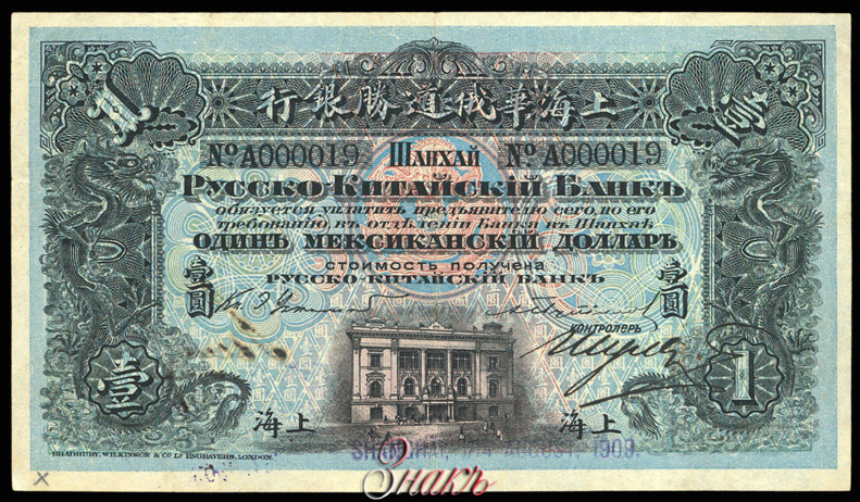 111111 Issues of Russian-Chinese Bank - Russian-Asian Bank. Paper Currency Directory = Russian-Chinese Bank. Shanghai branch. Banknote 1 Mexican dollar 1909.-222222