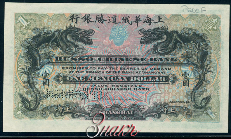 {SH2.0: §II. F-A/a} {§III} 1.1. Manufacturer: Bradbury Wilkinson & Co Ld. Engravers, London. 1.2. Signatures: RUSSO-CHINESE BANK: Prince E. Ukhtomsky, A. Puturov, Controller/Controller. The signature of the Controller is handwritten. 1.3. Numbering: No. A123456 - The serial number is printed twice on the front. Single-letter series. The number is six digits, black. 1.4. Size: 130mm x 73mm? 1.5. Paper/watermark type: not known. 1.6. Sign design elements: The main image of the front side : The building of the branch of the Russian-Chinese Bank in Shanghai. Decorated frame with dragons. Text in Russian and Chinese. Text: SHANGHAI Main image of the back: Two dragons. Text in English and Chinese. Text: RUSSO-CHINESE BANK Predominant colors: Hp black, background blue. O.S. black, multicolor background - pink and green. 1.7. Author (s) of the sign design: not known. 1.8. Sample types: SPECIMEN Type 1. - With signatures - Prince. E. Ukhtomsky, A. Puturov, without signature - Controller. Serial number - No. 000000. Original paper. Bilateral. "SPECIMEN" perforation. 2.1. Color samples are known. 3.1. Istomin M.I. Banknotes of "Russian China" Publishing house Ivanchenko I.S., Kharkov 2014 3.2. Kuznetsov A.Yu., Paramonov O.V. Paper money of Russian China. 2023 {Catalog code - "K-P "} 3.3. Standard Catalog of World Paper Money, Specialized Issues. Krause Publications; Twelfth Edition (12) (18. Dezember 2013)