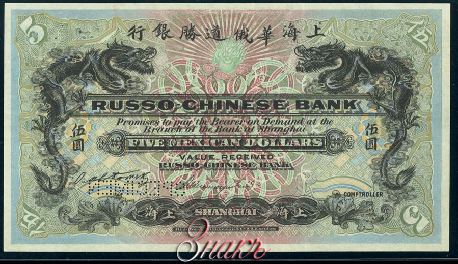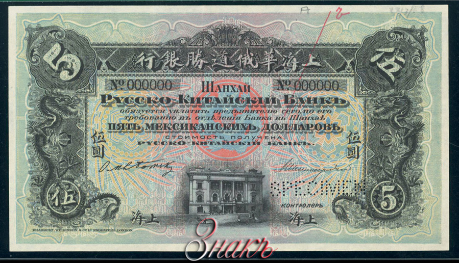 {SH2.0: §II. F-A/a} {§III} 1.1. Manufacturer: Bradbury Wilkinson & Co Ld. Engravers, London. 1.2. Signatures: RUSSO-CHINESE BANK: Prince E. Ukhtomsky, A. Puturov, Controller/Controller. The signature of the Controller is handwritten. 1.3. Numbering: No. A123456 - The serial number is printed twice on the front. Single-letter series. The number is six digits, black . 1.4. Size: 148mm x 83mm? 1.5. Paper/watermark type: not known. 1.6. Sign design elements: The main image of the front side : The building of the branch of the Russian-Chinese Bank in Shanghai. Decorated frame with dragons. Text in Russian and Chinese. Text: SHANGHAI Main image of the back: Two dragons. Text in English and Chinese. Text: RUSSO-CHINESE BANK Predominant colors: L. black, multicolor background - green. O.S. black, multicolor background - green and pink. 1.7. Author (s) of the sign design: not known. 1.8. Sample types: SPECIMEN Type 1A. - With signatures - Prince. E. Ukhtomsky, A. Puturov, without signature - Controller. Serial number - No. 000000. Original paper. Bilateral. "SPECIMEN" perforation. SPECIMEN Type 1B. - With signatures - Prince. E. Ukhtomsky, A. Puturov, without signature - Controller. Serial number - No. A000001- No. A100000. Original paper. Bilateral. "SPECIMEN" perforation. 2.1. Color samples are known. 3.1. Istomin M.I. Banknotes of "Russian China" Publishing house Ivanchenko I.S., Kharkov 2014 3.2. Kuznetsov A.Yu., Paramonov O.V. Paper money of Russian China. 2023 {Catalog code - "K-P "} 3.3. Standard Catalog of World Paper Money, Specialized Issues. Krause Publications; Twelfth Edition (12) (18. Dezember 2013)
