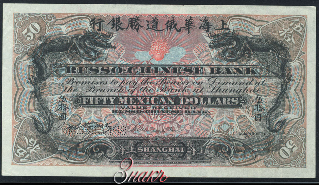 111111 Issues of Russian-Chinese Bank - Russian-Asian Bank. Paper Currency Directory = Russian-Chinese Bank. Shanghai branch. Mexican $50 banknote 1909.-222222