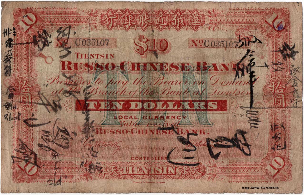 {SH2.0: §II. F-A/a} {§III} 1.1. Manufacturer: Nissen & Arnold. London. 1.2. Signatures: Russk- Kitayskіy Bank/RUSSO-CHINESE BANK: E.E. Ukhtomsky, A. Rotstein, Controller/Controller. The controller's signature is handwritten . 1.3. Numbering: No. A 123456 - The serial number is printed twice on the front and twice on the back. Single-letter series. The number is six digits, black. 1.4. Size: Not known. 1.5. Paper/watermark type: watermarked paper - bank name, denomination. 1.6. Sign design elements: The main image of the front side : text in Russian. The frame with the name of the department is TIEN-JIN, with a face value in the corners, text in Chinese. Text: $10 Main image of the back: text in English. The frame with the name of the branch is TIENTSIN, with a face value in the corners, text in Chinese. Text: $10 Predominant colors: L.S. and o.s. red. 1.7. Author (s) of the sign design: not known. 1.8. Sample types: SPECIMEN Type 1 - Signed by E.E. Ukhtomsky, A.Rotstein with number A 000000. Original paper. Bilateral. Specimen inscription. 2.1. Counterfeit banknotes are known to the detriment of circulation. [3.2, Art. 49] 3.1. Istomin M.I. Banknotes of "Russian China" Publishing house Ivanchenko I.S., Kharkov 2014 3.2. Kuznetsov A.Yu., Paramonov O.V. Paper money of Russian China. 2023 {Catalog code - "K-P "} 3.3. Standard Catalog of World Paper Money, Specialized Issues. Krause Publications; Twelfth Edition (12) (18. Dezember 2013)