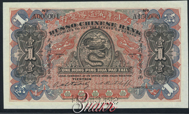 {SH2.0: §II. F-A/a} {§III} 1.1. Manufacturer (printer): Bradbury Wilkinson & CoLd London. 1.2. Signatures: RUSSO-CHINESE BANK: E. Ukhtomsky, A. Puturov, Controller/Controller. The controller's signature is handwritten. 1.3. Numbering: SERIES A No. A 123456 - The serial number is printed twice on the front. Single-letter series. The number is six digits, black. 1.4. Size: 135 x 79 mm. 1.5. Paper/watermark type: not known. 1.6. Sign design elements: Main image of the front side : Medallion in the center with a dragon. Ornament of multi-colored guilloches and dragons. Text in English and Chinese. Text: RUSSO-CHINESE BANK The main image of the reverse side: A medallion in the center with the building of the Russian-Chinese Bank. Ornament of multi-colored guilloches and dragons. Chinese language text. Predominant colors: L.S. and o.s. multicolor - black, pink, blue. 1.7. Author (s) of the sign design: not known. 1.8. Sample types: Samples are not known. SPECIMEN Type 1A. - With signatures - E. Ukhtomsky, A. Puturov, without signature - Controller. With SERIES A series, no serial number. Original paper. Bilateral. "SPECIMEN" perforation. SPECIMEN Type 1B. - With signatures - E. Ukhtomsky, A. Puturov, without signature - Controller. With SERIES A series, with serial number 000000 - 000000. Original paper. Bilateral. "SPECIMEN" perforation. SPECIMEN Type 1C. - With signatures - E. Ukhtomsky, A. Puturov, without signature - Controller. With SERIES A series, with serial number A000001 - A150000. Original paper. Bilateral. "SPECIMEN" perforation. 3.1. Istomin M.I. Banknotes of "Russian China" Publishing house Ivanchenko I.S., Kharkov 2014 3.2. Kuznetsov A.Yu., Paramonov O.V. Paper money of Russian China. 2023 {Catalog code - "K-P "} 3.3. Standard Catalog of World Paper Money, Specialized Issues. Krause Publications; Twelfth Edition (12) (18. Dezember 2013)