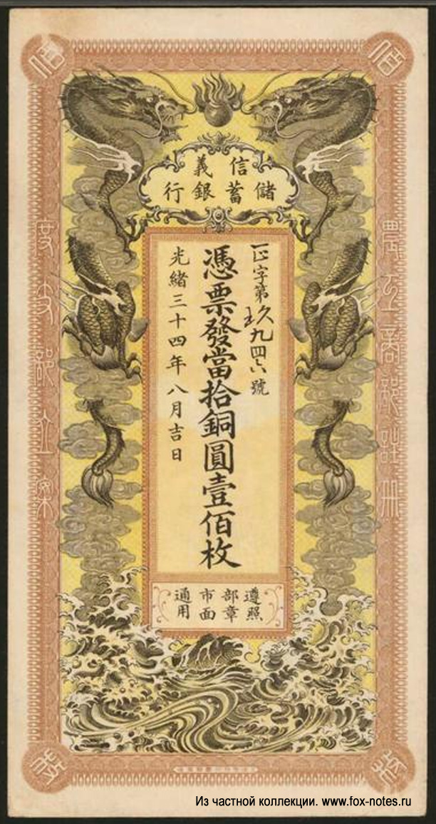 Shun Yee Savings bank 100 Coppers 1908Notes: * 1 Photo of the banknote from the auction of the Auction House Znak.