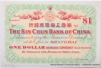 333333-Sin Chun Bank of China 1 dollar in Shanghai currency 1907-444444