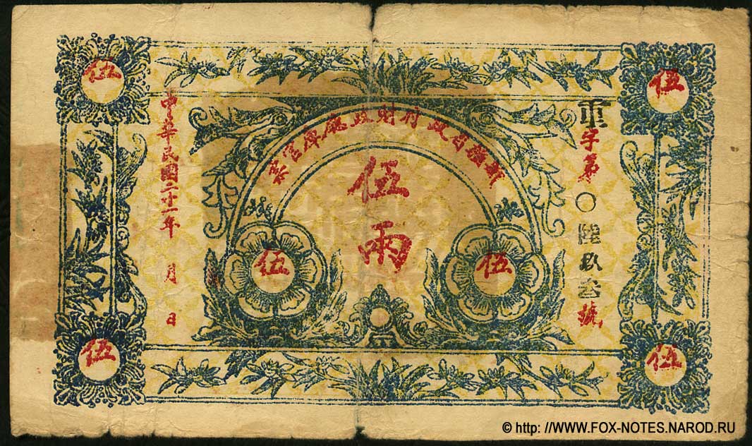 Sinkiang Sub-prefecture Administration Finanse Departament Treasury 5 taels