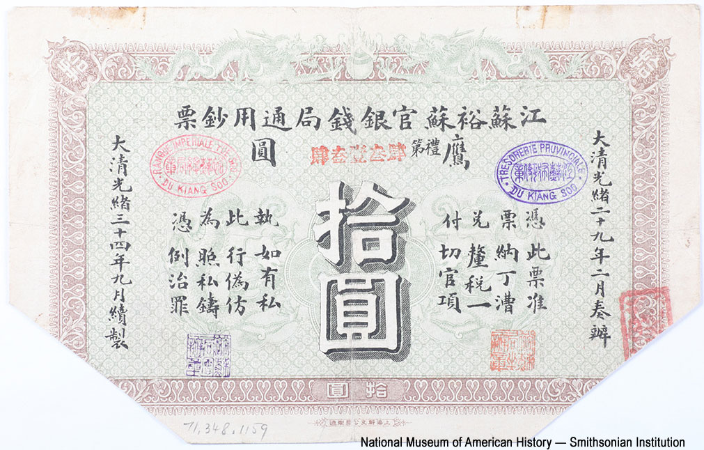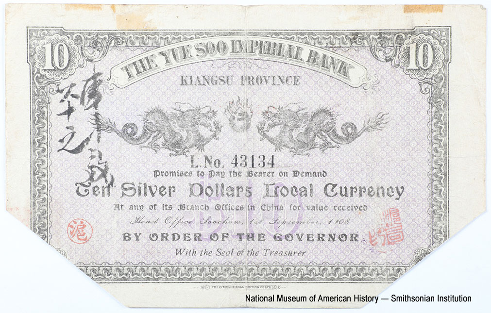 10 silver dollars in local currency - 1st September, 1908. 166 x 105 mm. [5.1]