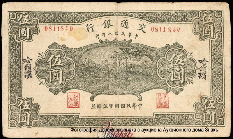 Issue 1914 Issue 1919 Issue 1920 Harbin American Bank Note Co Printing House Release of 1924 1st issue of 1927 2nd issue of 1927 Issue of 1931 Issue of 1935 Issue of 1935 Manufacturer/printer - Thomas De La Rue (TDLR). 1941 graduation. Manufacturer/Printer - American Bank Note Co (ABNCO) 1941 graduation. Manufacturer/Printer - Commercial Press (China) - CMPA 1941 graduation. Manufacturer/Printer - Dah Tung Book Release 1942 Ta Tung Printing House (China) Issue 1949 CIRCULATING CASHIER'S CHECKS Issue 1949 CIRCULATING CASHIER'S CHECKS (In gold yuan) CPF Printing Office. Note: * 1 Photo of the banknote from the auction of the Auction House Sign
