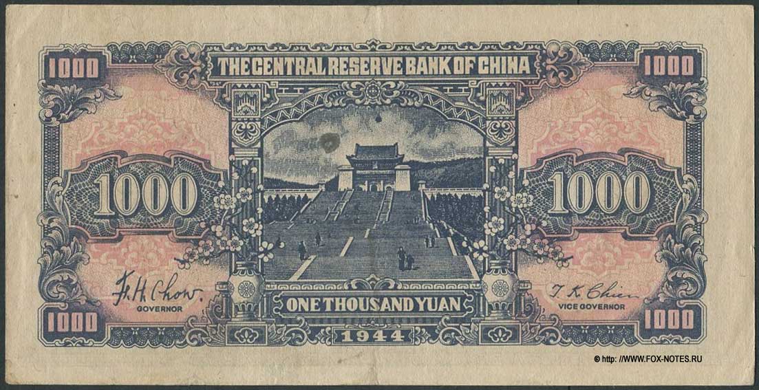 1000 yuan - 1944. (1945) Dark blue, multicolor background. RV close gray-blue. Series only. In\z "cloud."