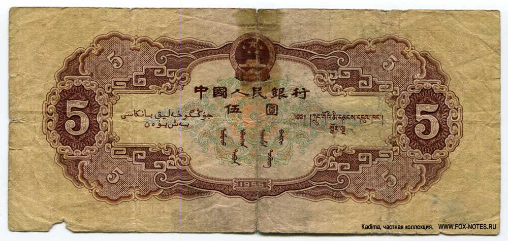 REFERENCE: Banknotes of the People's Bank of China (中國人民銀行, Zhōngguó Rénmín Yínháng) issues 1953-56. The issue of signs 1, 2 and 5 fyn was resumed in 1981 and continued until 1998.