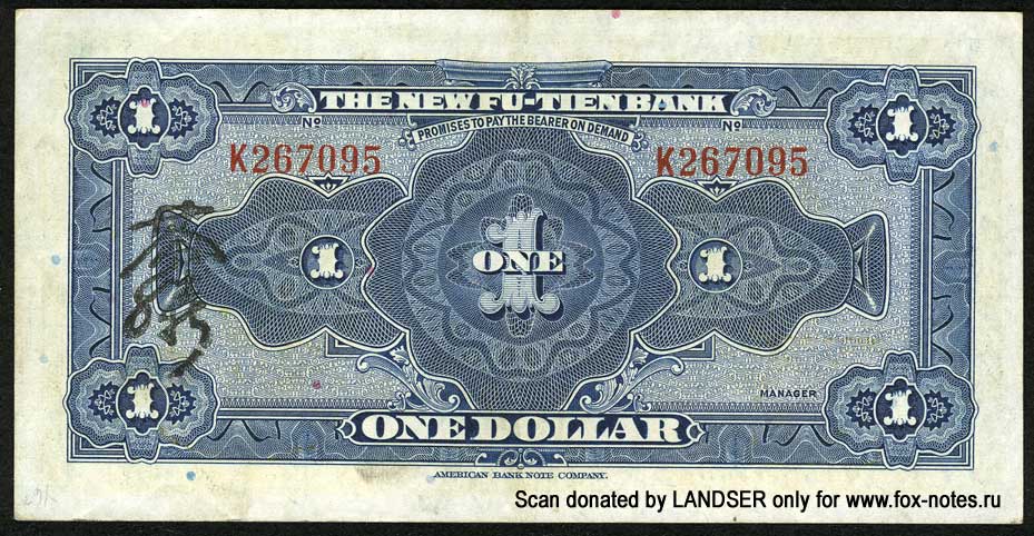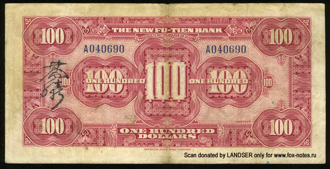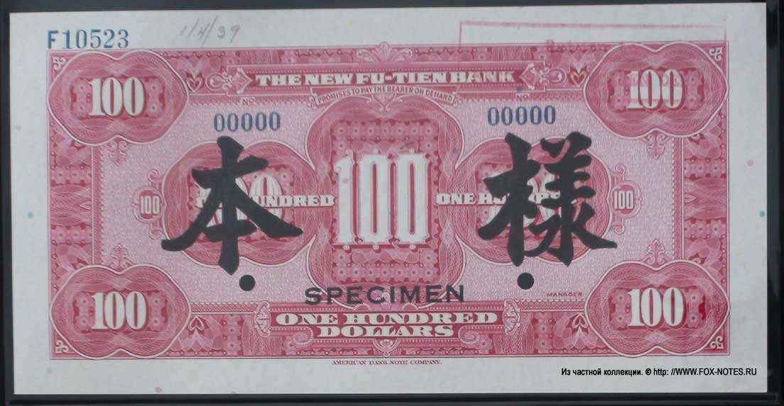 New Fu-Tien Bank - 行銀新滇富南雲 . 100 dollars 1929