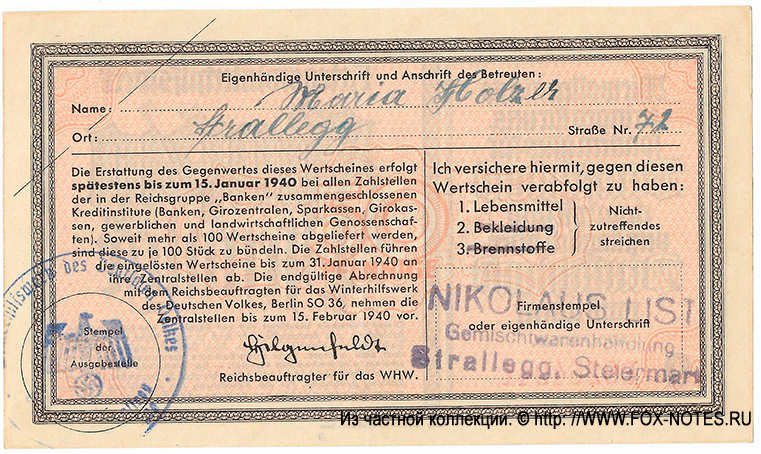 REFERENCE: Certificates Winterhilfswerk des Deutschen Volkes (Winter Aid to the German People).
