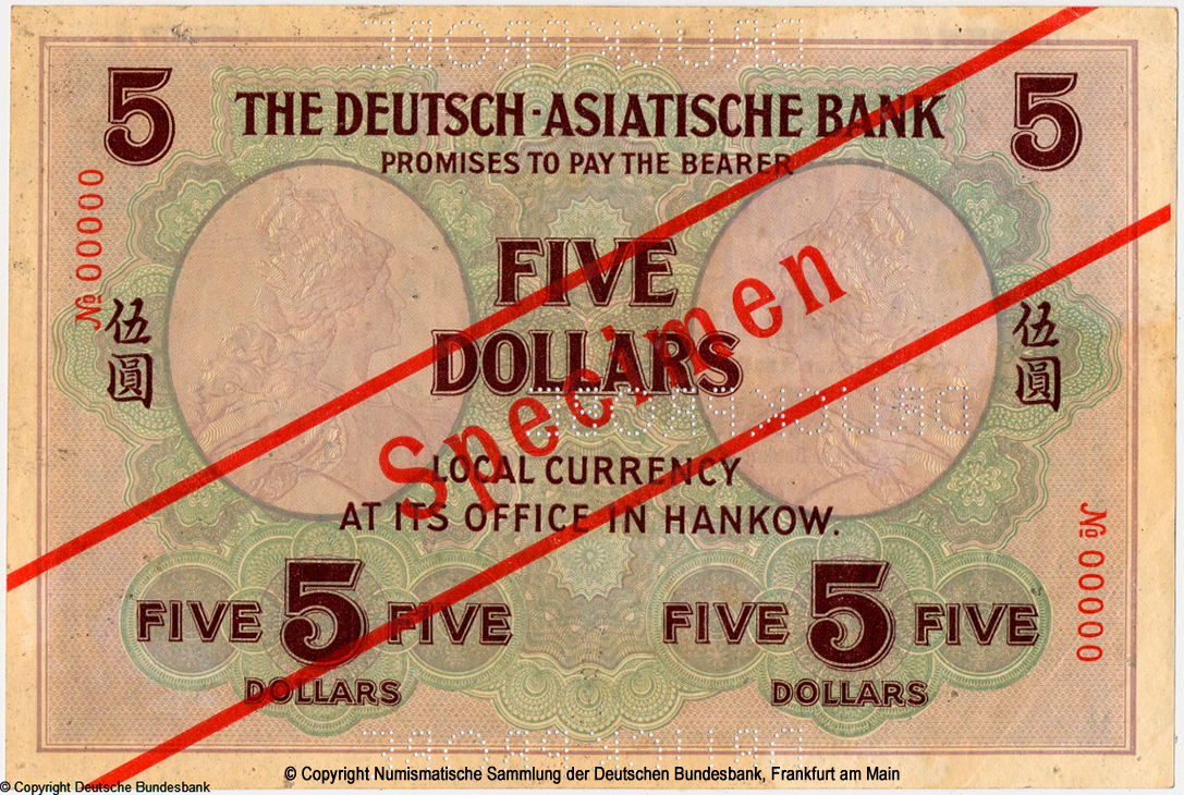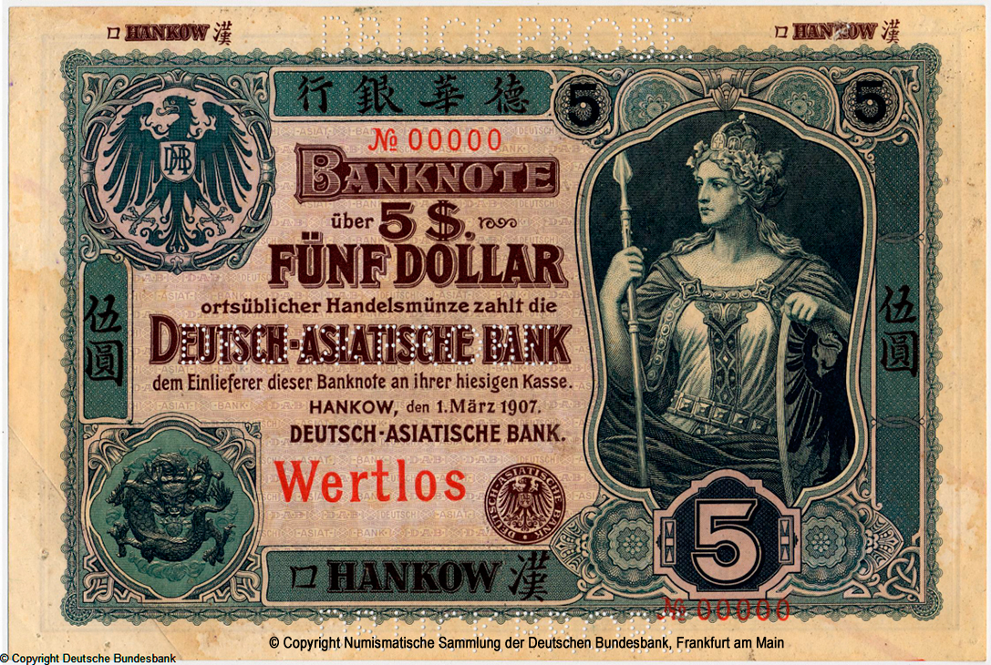 {SH2.0:  §II. F-A/a}  {§III}  1.1. Issue: Deutsch-Asiatische Bank (行銀華德, German-Asian Bank). Filiale  nach Hankow. Banknote. Hankow, den 1. März 1907. (Dollar) (1907 banknotes, in dollars) 3.1.Rosenberg H. Grabowski H.  Die deutschen Banknoten ab 1871. H.Gietl Verlag &  Publikationsservice GmbH, Regenstauf.Auflage: 19., Auflage 2013/2014  (REV). (31. Oktober 2013) ISBN 978-3866465534 3.2. Grabowski H. Die deutschen Banknoten ab 1871. Battenberg Gietl  Verlag GmbH. Auflage: 21., Auflage 2018 (7. Dezember 2017) {Catalog code - "Ro"} 3.3. Albert Pick Jens-Uwe Rixen (Bearb. Hans L.  Grabowski) Papiergeld-Spezialkatalog Deutschland. Auflage 3. Gietel  Verlag, 1998.  3.4. Standard Catalog of World Paper Money,  Specialized Issues. Krause Publications; Twelfth Edition (12) (18. Dezember 2013)  3.5. Smith Ward D., Matravers Brian. Chinese Banknotes. Shirjieh Pub. June 1970.