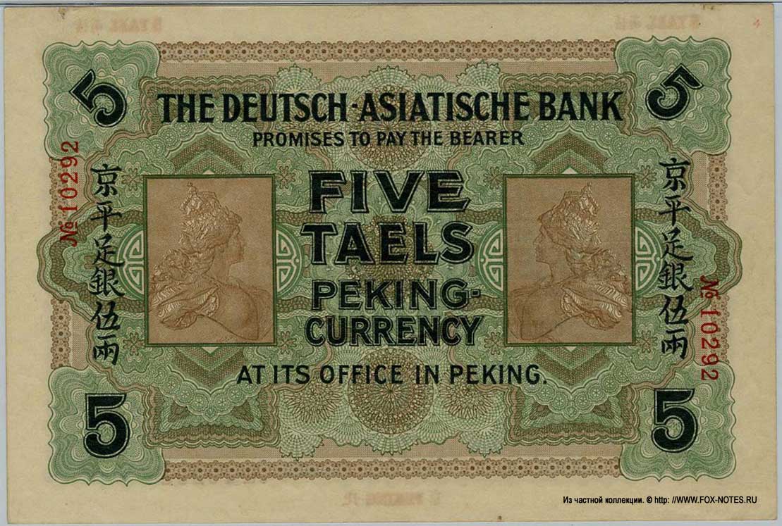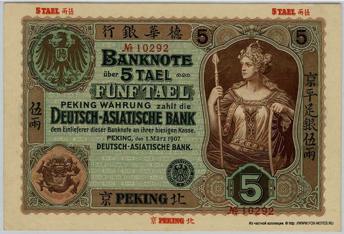 {SH2.0:  §II. F-A/a}  {§III}  1.1. Issue: Deutsch-Asiatische Bank (行銀華德, German-Asian Bank). Filiale  nach Peking. Banknote. Peking, den 1. März 1907. (Tael) (1907 banknotes, in lan) 3.1.Rosenberg H. Grabowski H.  Die deutschen Banknoten ab 1871. H.Gietl Verlag &  Publikationsservice GmbH, Regenstauf.Auflage: 19., Auflage 2013/2014  (REV). (31. Oktober 2013) ISBN 978-3866465534 3.2. Grabowski H. Die deutschen Banknoten ab 1871. Battenberg Gietl  Verlag GmbH. Auflage: 21., Auflage 2018 (7. Dezember 2017) {Catalog code - "Ro"} 3.3. Albert Pick Jens-Uwe Rixen (Bearb. Hans L.  Grabowski) Papiergeld-Spezialkatalog Deutschland. Auflage 3. Gietel  Verlag, 1998.  3.4. Standard Catalog of World Paper Money,  Specialized Issues. Krause Publications; Twelfth Edition (12) (18. Dezember 2013)  3.5. Smith Ward D., Matravers Brian. Chinese Banknotes. Shirjieh Pub. June 1970.