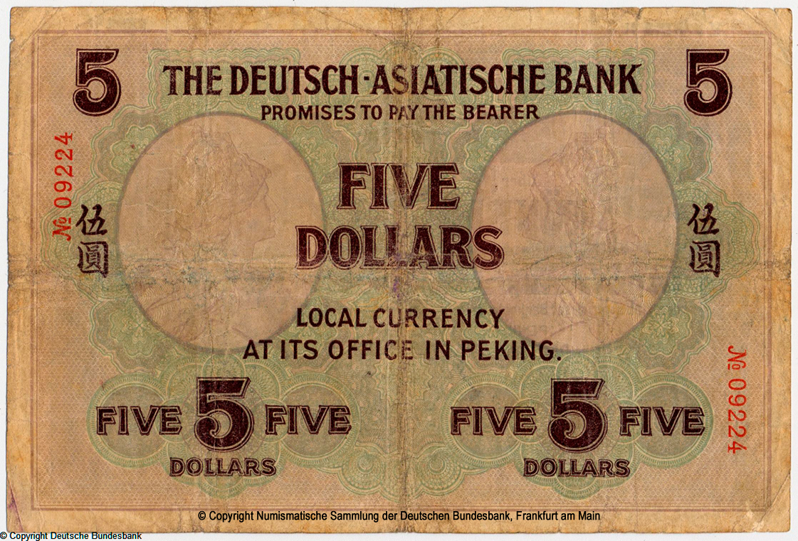 Banknote über 10 Dollar. Peking, den 1. März  1907. Banknote über 25 Dollar. Peking, den 1. März  1907. Banknote über 50 Dollar. Peking, den 1. März  1907. {SH2.0:  §II. F-A/a}  {§III}  1.1. Issue: Deutsch-Asiatische Bank (行銀華德, German-Asian Bank). Filiale  nach Peking. Banknote. Peking, den 1. März 1907. (Dollar) (1907 banknotes, in dollars) 3.1.Rosenberg H. Grabowski H.  Die deutschen Banknoten ab 1871. H.Gietl Verlag &  Publikationsservice GmbH, Regenstauf.Auflage: 19., Auflage 2013/2014  (REV). (31. Oktober 2013) ISBN 978-3866465534 3.2. Grabowski H. Die deutschen Banknoten ab 1871. Battenberg Gietl  Verlag GmbH. Auflage: 21., Auflage 2018 (7. Dezember 2017) {Catalog code - "Ro"} 3.3. Albert Pick Jens-Uwe Rixen (Bearb. Hans L.  Grabowski) Papiergeld-Spezialkatalog Deutschland. Auflage 3. Gietel  Verlag, 1998.  3.4. Standard Catalog of World Paper Money,  Specialized Issues. Krause Publications; Twelfth Edition (12) (18. Dezember 2013)  3.5. Smith Ward D., Matravers Brian. Chinese Banknotes. Shirjieh Pub. June 1970.