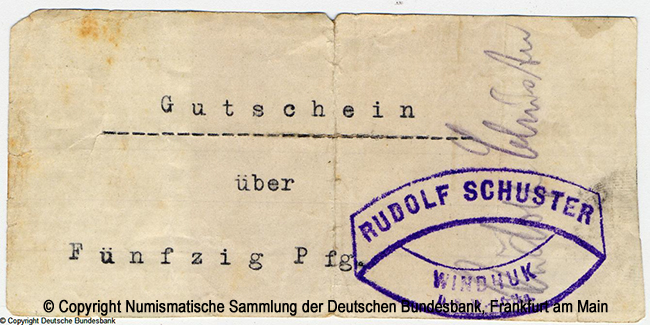 Rudolf Schuster / Windhuk 50 Pfennig 1916 Notes: 1. * 1 - Photo of a banknote from the Deutsche Bundesbank collection, Frankfurt am Main. © Copyright Numismatische Sammlung der Deutschen Bundesbank, Frankfurt am Main.