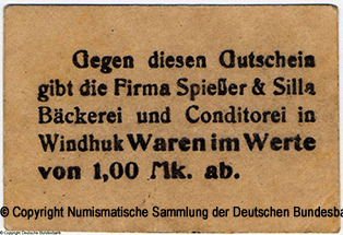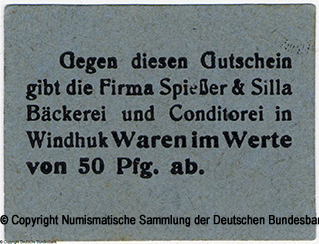 Spießer & Silla Bäckerei und Conditorei 50 Pfennig Notes: 1. * 1 - Photo of a banknote from the Deutsche Bundesbank collection, Frankfurt am Main. © Copyright Numismatische Sammlung der Deutschen Bundesbank, Frankfurt am Main.