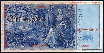 100 marks - 21. April 1910. "Muster-Abdruck - werthlos". A.0000000 (SAMPLE) L.S. and o.s. separately.