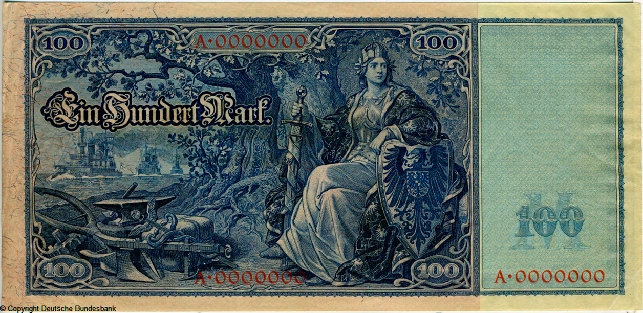 {SH2.0: §II. F-A/a}  {§III}  1.1. Issue : Issues of the Reichsbank of the German Empire. Imperial banknotes (Reichsbanknote) 100 Mark. 1908 type "Flotten-Hunderter." Imperial banknotes 100 stamps type 1908 withdrawn from circulation 05.07.1925  2.1. Reichsbankdirektorium seals: