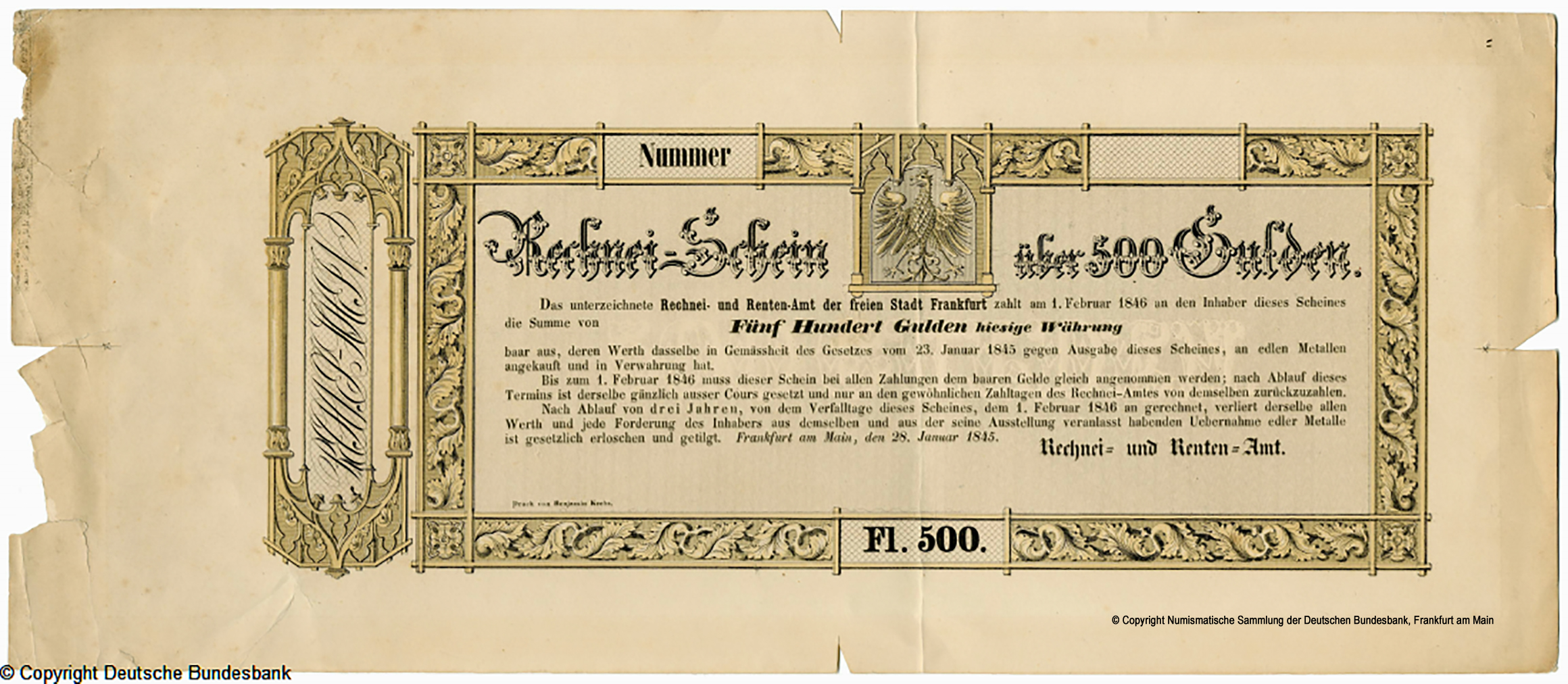 Rechnei und Rentenamt 500 Gulden 1845Notes: 1. * 1 - Photo of a banknote from the Deutsche Bundesbank collection, Frankfurt am Main. © Copyright Numismatische Sammlung der Deutschen Bundesbank, Frankfurt am Main.