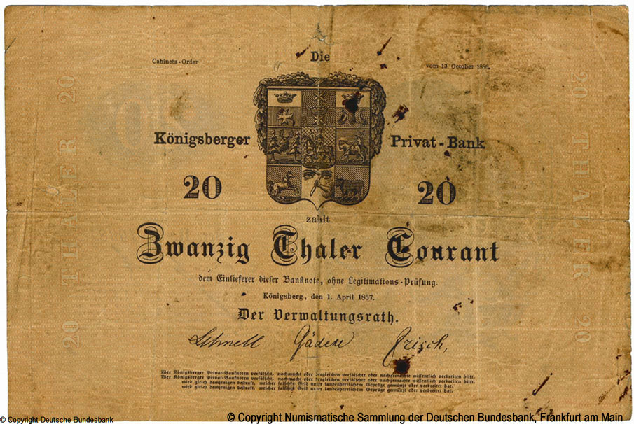 Königsberger Privatbank 20 Thaler Courant 1857Notes: 1. * 1 Photo of a banknote from the Deutsche Bundesbank collection, Frankfurt am Main. © Copyright Numismatische Sammlung der Deutschen Bundesbank, Frankfurt am Main.