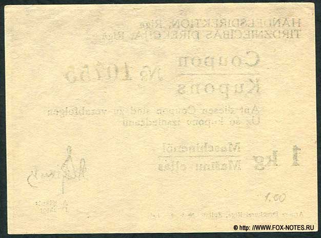Handelsdirektion, Riga Latvia. 1 kg machine oil coupon 1 kg. Maschinenöl 1941 MaschinenÖl Coupon OSL4d