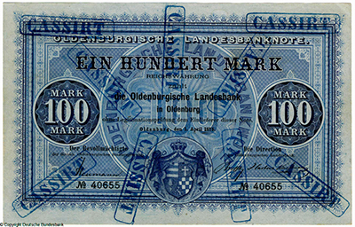 Oldenburgissche Landesbankbanknote. 100 Mark. 1. April 1875. Notes: