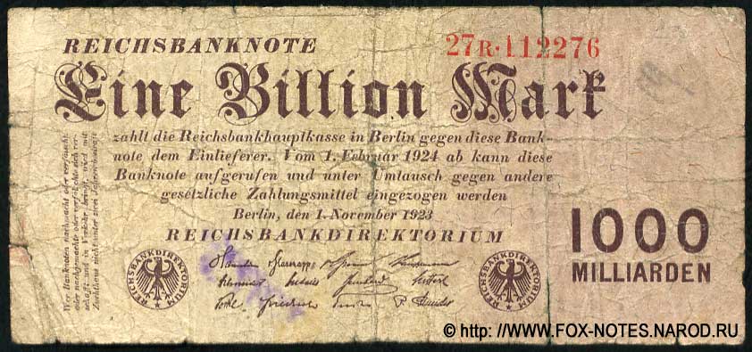 Reichsbank. Reichsbanknote. 1 Billion Mark. 1. November 1923. (Imperial banknote 1 billion marks 1923 Type 1)