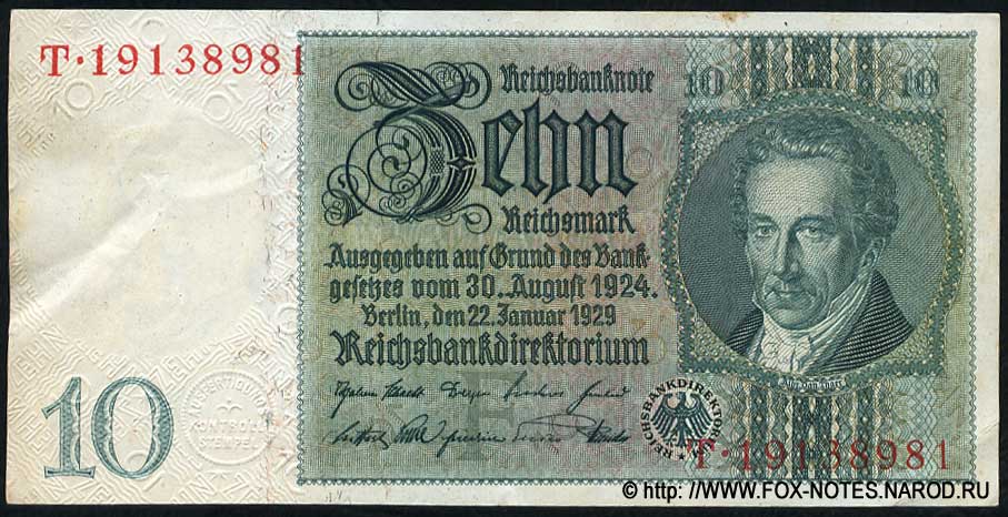 1.1. Reichsbanknote. 22. Januar 1929. подписывались: Reichsbankdirektorium - Dr. Hjalmar Schacht, Dreyse, Budczies, Bernhard, Seiffer, Vocke, Fridrich, Fuchs, P. Scheider.