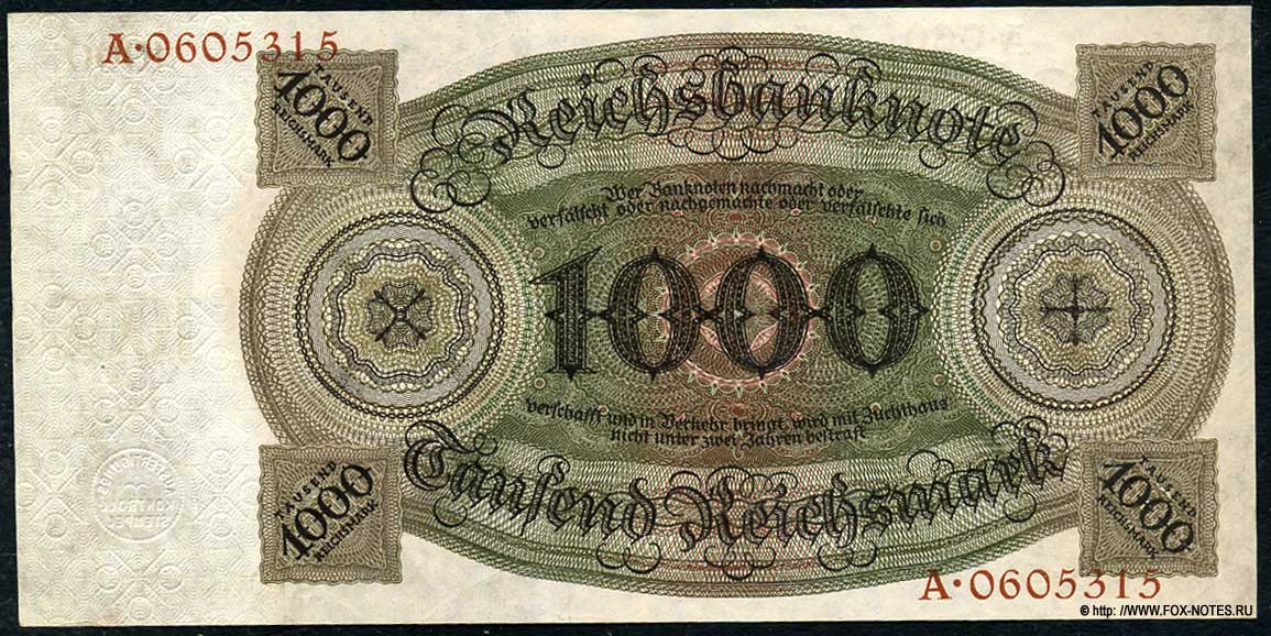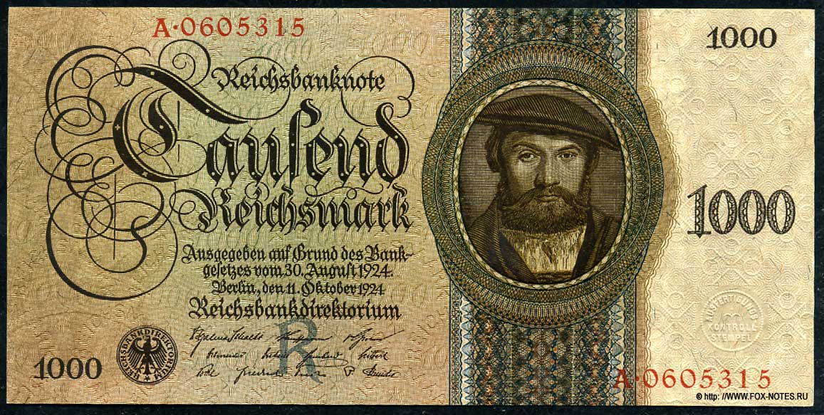 1.1. Reichsbanknote. 15. März 1924. подписывались: Reichsbankdirektorium - Dr. Hjaalmar Schacht, Kauffmann, von Grimm, Schneider, Budczies, Bernhard, Seiffer, Vocke, Fridrich, Fuchs, P. Scheider.