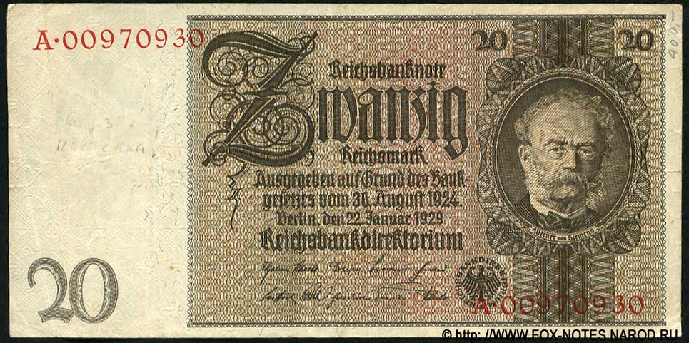 20 Reichsmarks - 22. Januar 1929. 3 type ( military