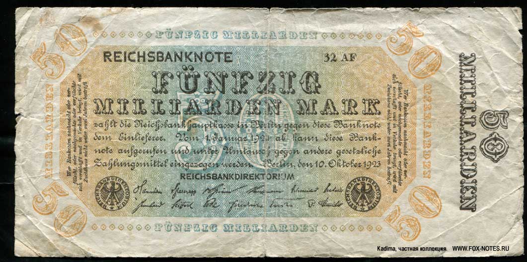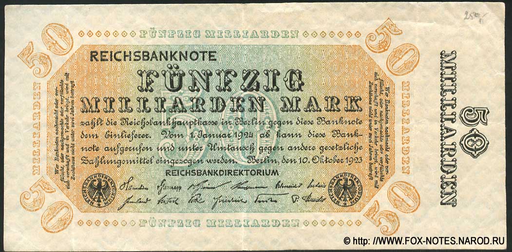 Reichsbank. Reichsbanknote. 50 Milliarden Mark. 10. Oktober 1923. Type 1. (Imperial banknote 50 billion marks 1923)