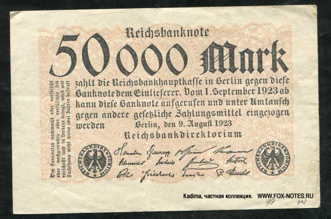 Reichsbank. Reichsbanknote. 50000 Mark. 9. August 1923. (Imperial banknote 50,000 marks 1923)