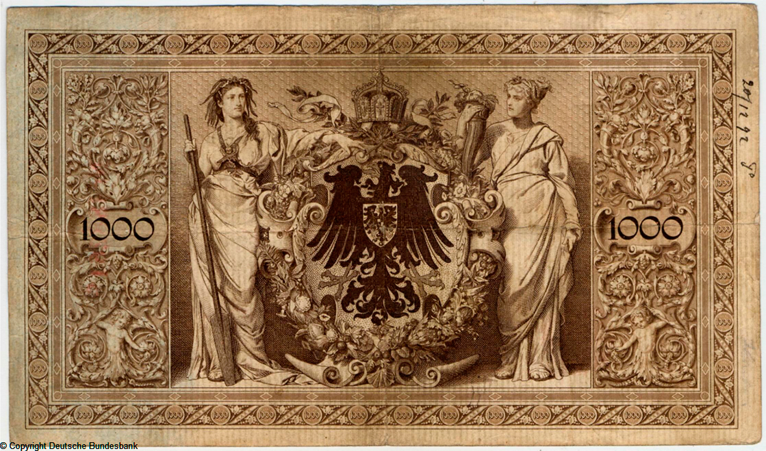{SH2.0: §II. F-A/a} {§III} 1.1. Manufacturer ( printing house): Reichsdruckerei 1.2. Подписи: Reichsbankdirektorium - von Dechend, Boese, von Rotth, Dr. Gallenkamp, Herrmann, Dr. Friedrich Koch, von Könen. 1.3. Numbering: Nr123456a - one-letter series, six-digit number. The color of the number is red. 1.4. Size: 187 x 110 mm. 1.5. Paper/watermark type: Paper without watermarks, with blue localized fibers. Paper with vertical embossing throughout the field. 1.6. Sign design elements: The main image of the front side : Coat of arms of the German Empire (in the background), seals of the German Reichsbank, text. Text: 1000 Reichsbanknote. 1000 The main image of the reverse side: the coat of arms of the German Empire in a wreath of laurel branches crowned with the imperial crown. On the left is a woman with a paddle as the personification of shipping, on the right is a female figure with a horn of abundance as the personification of fertility. Text: 1000 1000 Predominant colors: Dark brown, brown. 1.7. Author (s) of sign design: Artists - Ferdinand Luthmer, Otto Knille, engraver - Hans Meyer. 1.8. Sample types: MUSTER (Type 1): Signed by officers Serial number of the Nr000000a. HP and OS separately. Original paper. Black overprints "Muster-Abdruck - werthlos" on hp and os. Perforation "DRUCKPROBE" four times at the edges of the sign. 1.9. Reichsbankdirektorium seals: one red seal. 1.9. Dates of circulation of the sign: Introduced: November 1884 Canceled: July 5, 1925 3.1. Rosenberg H. Grabowski H. Die deutschen Banknoten ab 1871. H.Gietl Verlag & Publikationsservice GmbH, Regenstauf.Auflage: 19., Auflage 2013/2014 (REV). (31. Oktober 2013) ISBN 978-3866465534 3.2. Grabowski H. Die deutschen Banknoten ab 1871. Battenberg Gietl Verlag GmbH. Auflage: 21., Auflage 2018 (7. Dezember 2017) {Catalog code - "Ro"} 3.3. Albert Pick Jens-Uwe Rixen (Bearb. Hans L. Grabowski) Papiergeld-Spezialkatalog Deutschland. Auflage 3. Gietel Verlag, 1998. 3.4. Standard Catalog of World Paper Money, Specialized Issues. Krause Publications; Twelfth Edition (12) (18. Dezember 2013) {Catalog code - "P"} 3.5. Michael H. Schöne, Die Varianten der deutschen Reichsbanknoten 1876 bis 1914. Verlag: Eigenverlag, Pirna. Auflage: 2008.