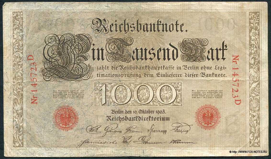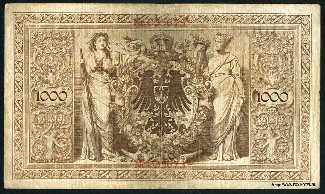 Unterdruck-Buchstabe Number and series 1.4. Size: 187 x 110 mm. 1.5. Paper/watermark type: Paper without watermarks, with blue localized fibers. Paper with vertical embossing throughout the field. 1.6. Sign design elements: The main image of the front side : Coat of arms of the German Empire (in the background), seals of the German Reichsbank, text. Text: 1000 Reichsbanknote. 1000 The main image of the reverse side: the coat of arms of the German Empire in a wreath of laurel branches crowned with the imperial crown. On the left is a woman with a paddle as the personification of shipping, on the right is a female figure with a horn of abundance as the personification of fertility. Text: 1000 1000 Predominant colors: Dark brown, brown. 1.7. Author (s) of sign design: Artists - Ferdinand Luthmer, Otto Knille, engraver - Hans Meyer. 1.8. Sample types: unknown (not manufactured) 1.9. Reichsbankdirektorium seals: two red seals. 1.9. Dates of circulation of the sign: Introduced: April 1903 Canceled: July 5, 1925 3.1. Rosenberg H. Grabowski H. Die deutschen Banknoten ab 1871. H.Gietl Verlag & Publikationsservice GmbH, Regenstauf.Auflage: 19., Auflage 2013/2014 (REV). (31. Oktober 2013) ISBN 978-3866465534 3.2. Grabowski H. Die deutschen Banknoten ab 1871. Battenberg Gietl Verlag GmbH. Auflage: 21., Auflage 2018 (7. Dezember 2017) {Catalog code - "Ro"} 3.3. Albert Pick Jens-Uwe Rixen (Bearb. Hans L. Grabowski) Papiergeld-Spezialkatalog Deutschland. Auflage 3. Gietel Verlag, 1998. 3.4. Standard Catalog of World Paper Money, Specialized Issues. Krause Publications; Twelfth Edition (12) (18. Dezember 2013) {Catalog code - "P"} 3.5. Michael H. Schöne, Die Varianten der deutschen Reichsbanknoten 1876 bis 1914. Verlag: Eigenverlag, Pirna. Auflage: 2008.