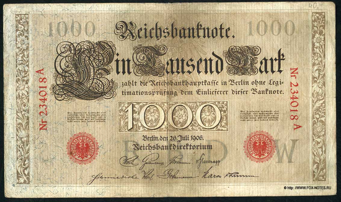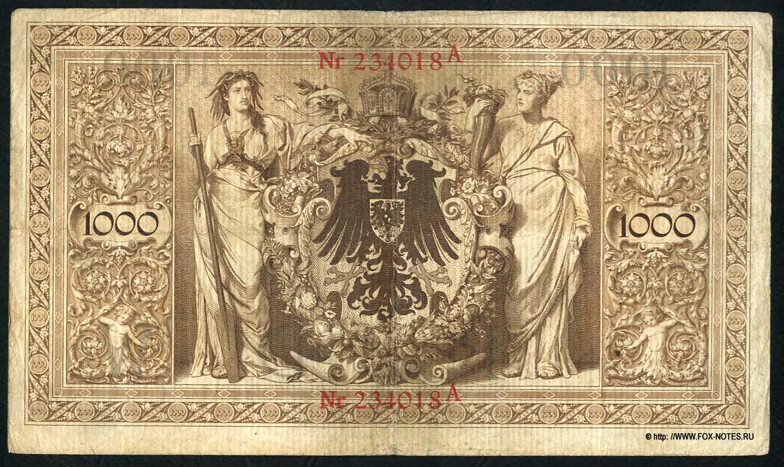 Unterdruck-Buchstabe Number and series 1.4. Size: 187 x 110 mm. 1.5. Paper/watermark type: Paper without watermarks, with blue localized fibers. Paper with vertical embossing throughout the field. 1.6. Sign design elements: The main image of the front side : Coat of arms of the German Empire (in the background), seals of the German Reichsbank, text. Text: 1000 Reichsbanknote. 1000 The main image of the reverse side: the coat of arms of the German Empire in a wreath of laurel branches crowned with the imperial crown. On the left is a woman with a paddle as the personification of shipping, on the right is a female figure with a horn of abundance as the personification of fertility. Text: 1000 1000 Predominant colors: Dark brown, brown. 1.7. Author (s) of sign design: Artists - Ferdinand Luthmer, Otto Knille, engraver - Hans Meyer. 1.8. Sample types: unknown (not manufactured) 1.9. Reichsbankdirektorium seals: two red seals. 1.9. Dates of circulation of the sign: Introduced: July 1907 Canceled: July 5, 1925 3.1. Rosenberg H. Grabowski H. Die deutschen Banknoten ab 1871. H.Gietl Verlag & Publikationsservice GmbH, Regenstauf.Auflage: 19., Auflage 2013/2014 (REV). (31. Oktober 2013) ISBN 978-3866465534 3.2. Grabowski H. Die deutschen Banknoten ab 1871. Battenberg Gietl Verlag GmbH. Auflage: 21., Auflage 2018 (7. Dezember 2017) {Catalog code - "Ro"} 3.3. Albert Pick Jens-Uwe Rixen (Bearb. Hans L. Grabowski) Papiergeld-Spezialkatalog Deutschland. Auflage 3. Gietel Verlag, 1998. 3.4. Standard Catalog of World Paper Money, Specialized Issues. Krause Publications; Twelfth Edition (12) (18. Dezember 2013) {Catalog code - "P"} 3.5. Michael H. Schöne, Die Varianten der deutschen Reichsbanknoten 1876 bis 1914. Verlag: Eigenverlag, Pirna. Auflage: 2008.