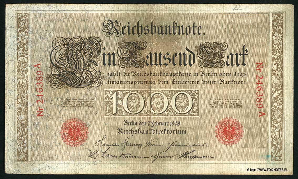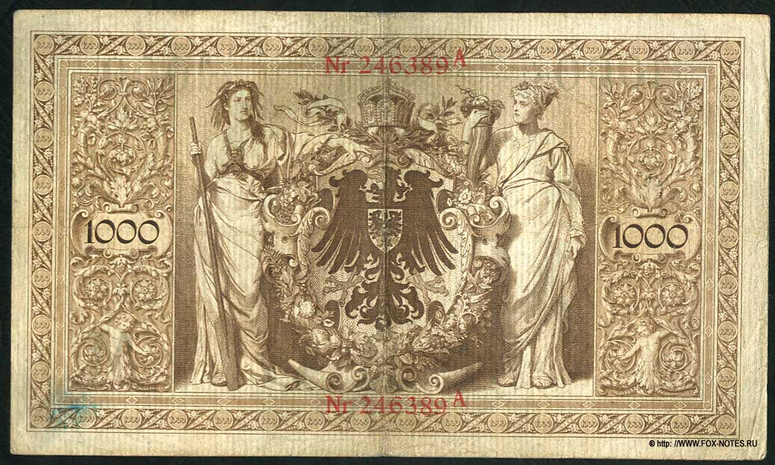 Unterdruck-Buchstabe Number and series 1.4. Size: 187 x 110 mm. 1.5. Paper/watermark type: Paper without watermarks, with blue localized fibers. Paper with vertical embossing throughout the field. 1.6. Sign design elements: The main image of the front side : Coat of arms of the German Empire (in the background), seals of the German Reichsbank, text. Text: 1000 Reichsbanknote. 1000 The main image of the reverse side: the coat of arms of the German Empire in a wreath of laurel branches crowned with the imperial crown. On the left is a woman with a paddle as the personification of shipping, on the right is a female figure with a horn of abundance as the personification of fertility. Text: 1000 1000 Predominant colors: Dark brown, brown. 1.7. Author (s) of sign design: Artists - Ferdinand Luthmer, Otto Knille, engraver - Hans Meyer. 1.8. Sample types: unknown (not manufactured) 1.9. Reichsbankdirektorium seals: two red seals. 1.9. Dates of circulation of the sign: Introduced: April 1908 Canceled: July 5, 1925 3.1. Rosenberg H. Grabowski H. Die deutschen Banknoten ab 1871. H.Gietl Verlag & Publikationsservice GmbH, Regenstauf.Auflage: 19., Auflage 2013/2014 (REV). (31. Oktober 2013) ISBN 978-3866465534 3.2. Grabowski H. Die deutschen Banknoten ab 1871. Battenberg Gietl Verlag GmbH. Auflage: 21., Auflage 2018 (7. Dezember 2017) {Catalog code - "Ro"} 3.3. Albert Pick Jens-Uwe Rixen (Bearb. Hans L. Grabowski) Papiergeld-Spezialkatalog Deutschland. Auflage 3. Gietel Verlag, 1998. 3.4. Standard Catalog of World Paper Money, Specialized Issues. Krause Publications; Twelfth Edition (12) (18. Dezember 2013) {Catalog code - "P"} 3.5. Michael H. Schöne, Die Varianten der deutschen Reichsbanknoten 1876 bis 1914. Verlag: Eigenverlag, Pirna. Auflage: 2008.