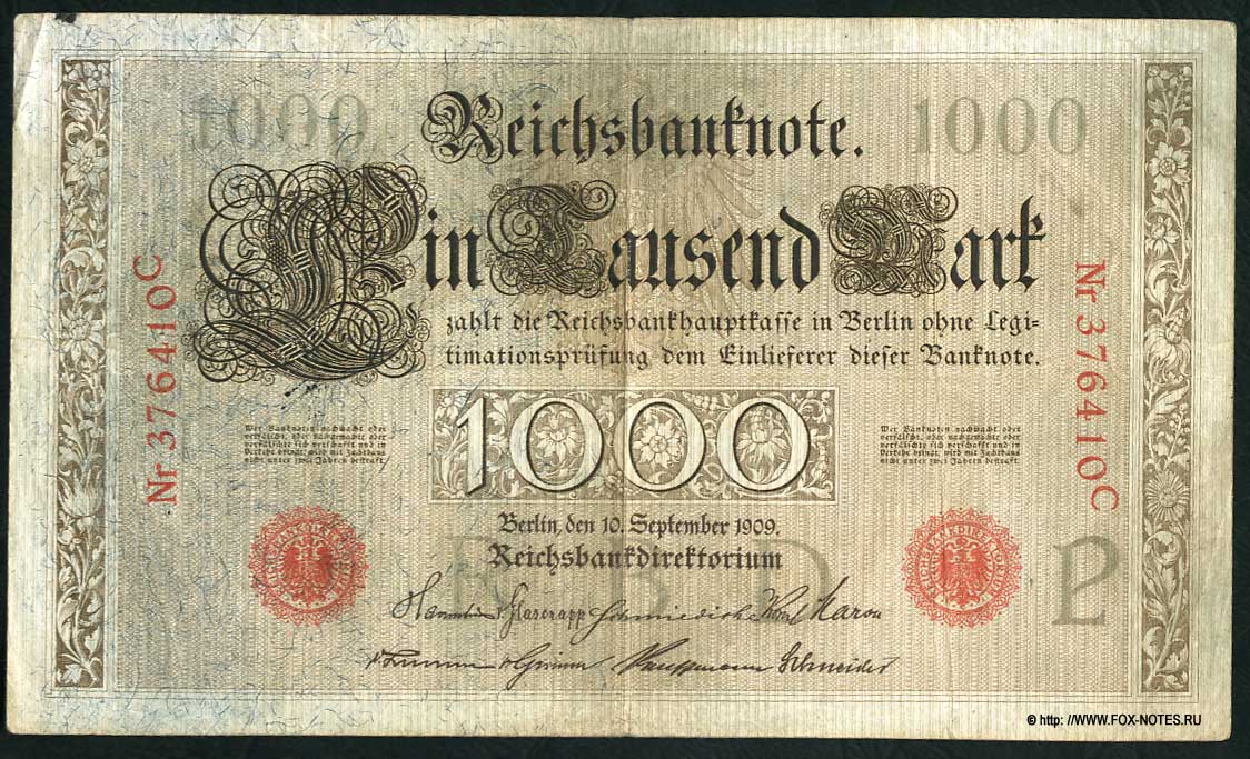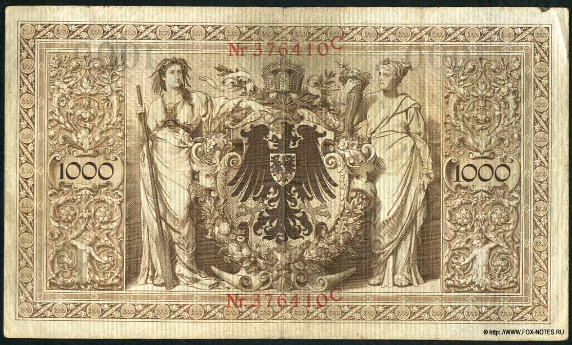 Unterdruck-Buchstabe Number and series 1.4. Size: 187 x 110 mm. 1.5. Paper/watermark type: Paper without watermarks, with blue localized fibers. Paper with vertical embossing throughout the field. 1.6. Sign design elements: The main image of the front side : Coat of arms of the German Empire (in the background), seals of the German Reichsbank, text. Text: 1000 Reichsbanknote. 1000 The main image of the reverse side: the coat of arms of the German Empire in a wreath of laurel branches crowned with the imperial crown. On the left is a woman with a paddle as the personification of shipping, on the right is a female figure with a horn of abundance as the personification of fertility. Text: 1000 1000 Predominant colors: Dark brown, brown. 1.7. Author (s) of sign design: Artists - Ferdinand Luthmer, Otto Knille, engraver - Hans Meyer. 1.8. Sample types: unknown (not manufactured) 1.9. Reichsbankdirektorium seals: two red seals. 1.9. Dates of circulation of the sign: Introduced: April 1910 Canceled: July 5, 1925 3.1. Rosenberg H. Grabowski H. Die deutschen Banknoten ab 1871. H.Gietl Verlag & Publikationsservice GmbH, Regenstauf.Auflage: 19., Auflage 2013/2014 (REV). (31. Oktober 2013) ISBN 978-3866465534 3.2. Grabowski H. Die deutschen Banknoten ab 1871. Battenberg Gietl Verlag GmbH. Auflage: 21., Auflage 2018 (7. Dezember 2017) {Catalog code - "Ro"} 3.3. Albert Pick Jens-Uwe Rixen (Bearb. Hans L. Grabowski) Papiergeld-Spezialkatalog Deutschland. Auflage 3. Gietel Verlag, 1998. 3.4. Standard Catalog of World Paper Money, Specialized Issues. Krause Publications; Twelfth Edition (12) (18. Dezember 2013) {Catalog code - "P"} 3.5. Michael H. Schöne, Die Varianten der deutschen Reichsbanknoten 1876 bis 1914. Verlag: Eigenverlag, Pirna. Auflage: 2008.