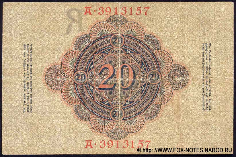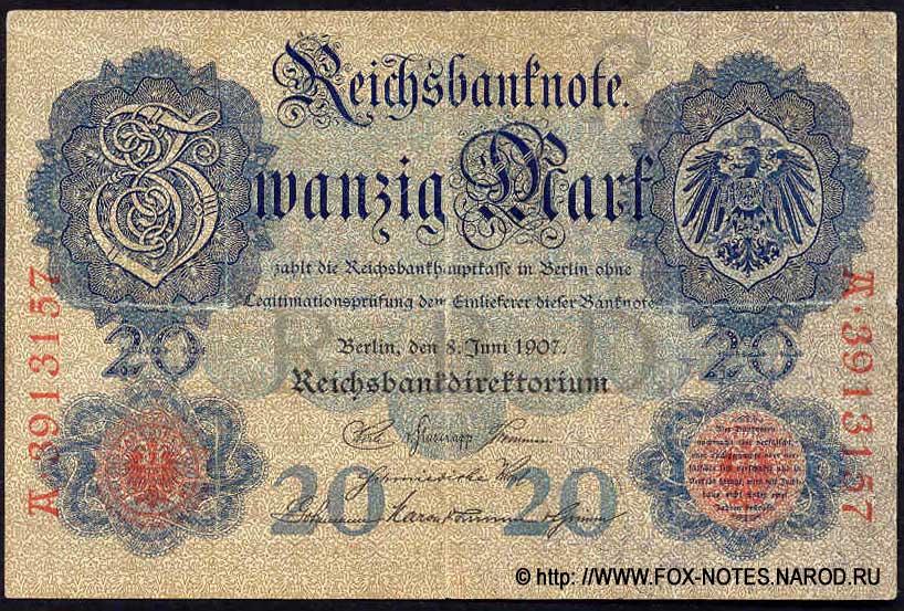 Unterdruck-Buchstabe Number and series 1.4. Size: 136 x 90 mm. 1.5. Paper/watermark type: Paper without watermarks, with protective fibres. Paper with vertical embossing throughout the field. 1.6. Sign design elements: The main image of the front side : Coat of arms of the German Empire, seals of the German Reichsbank, text. Text: Reichsbanknote. The main image of the reverse side: Guilloche with a face value. Text: 20 MARK REICHSBANKNOTE Predominant colors: Hp dark blue, red, background light brown, blue. O.S. red, blue, light brown background. 1.7. Author (s) of the sign design: not known. 1.8. Sample types: Samples are not known. 1.9. Reichsbankdirektorium seals: two red seals. 1.10. Dates of circulation of the sign: Introduced: July 1907 Canceled: July 5, 1925 3.1. Rosenberg H. Grabowski H. Die deutschen Banknoten ab 1871. H.Gietl Verlag & Publikationsservice GmbH, Regenstauf.Auflage: 19., Auflage 2013/2014 (REV). (31. Oktober 2013) ISBN 978-3866465534 3.2. Grabowski H. Die deutschen Banknoten ab 1871. Battenberg Gietl Verlag GmbH. Auflage: 21., Auflage 2018 (7. Dezember 2017) {Catalog code - "Ro"} 3.3. Albert Pick Jens-Uwe Rixen (Bearb. Hans L. Grabowski) Papiergeld-Spezialkatalog Deutschland. Auflage 3. Gietel Verlag, 1998. 3.4. Standard Catalog of World Paper Money, Specialized Issues. Krause Publications; Twelfth Edition (12) (18. Dezember 2013) {Catalog code - "P"} 3.5. Michael H. Schöne, Die Varianten der deutschen Reichsbanknoten 1876 bis 1914. Verlag: Eigenverlag, Pirna. Auflage: 2008.