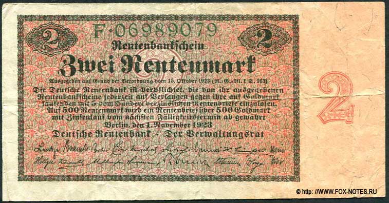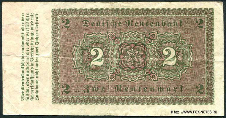 Deutschen Rentenbank. Rentenbankschein. 2 Rentenmark. 1. November 1923.