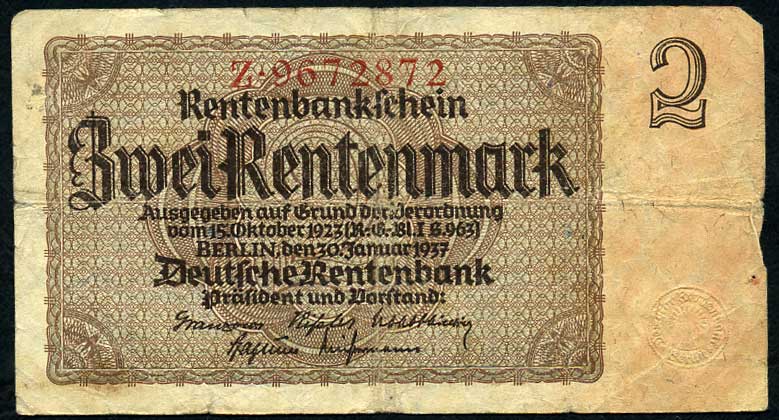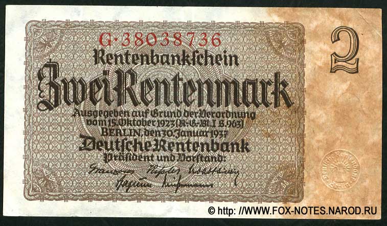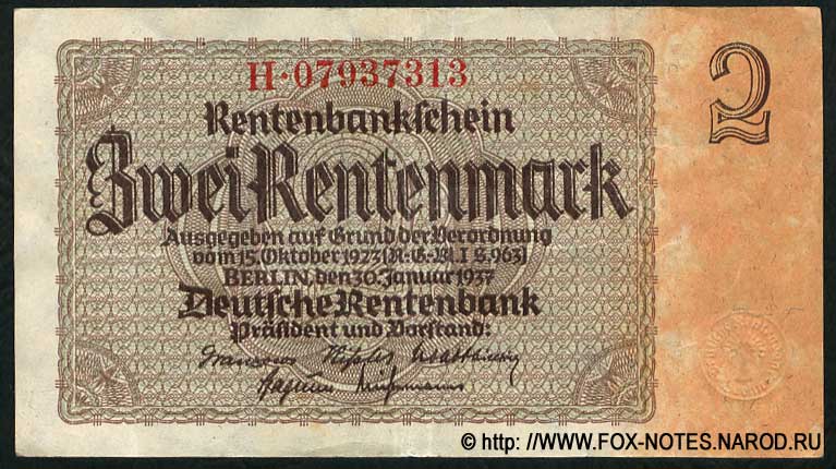 1.1. Rentenbankschein. Rentenbankschein. 30. Januar 1937. подписывались: Deutschen Rentenbank Der Verwaltungsrat - Granzow, Kissler, Dr. Kokotkiewicz, Dr. Szagunn, Wichtermann.