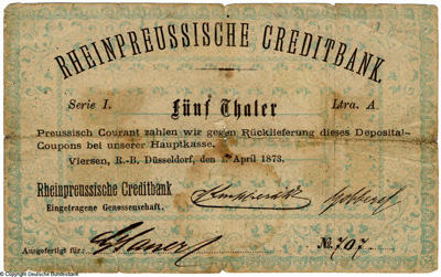 333333-Rheinpreussische Creditbank Genossenschaftlicher Deposital-Coupon. 1 Thaler. 1. April 1873.-444444