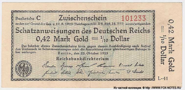 Reichsbank. Zwischenshein. Schatzanweisungen des Deutschen Reiches. 0,42 Mark Gold = 1/10 Dollar. 23. Oktober 1923. (Treasury obligation 0.42 marks gold 1923)