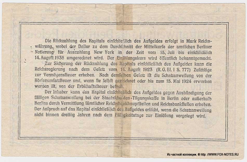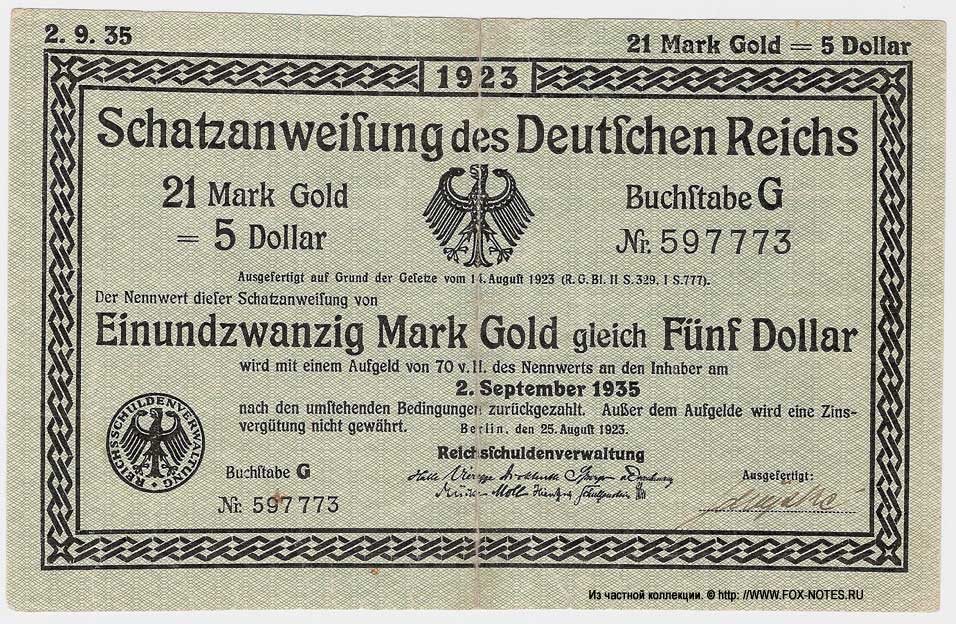 Reichsschuldenverwaltung. Schatzanweisungen des Deutschen Reiches. 21 Mark Gold = 5 Dollar. 25. August 1923. Reiche 1. (Treasury obligation 21 marks in gold 1923)