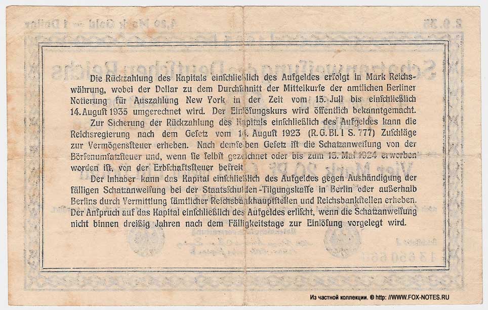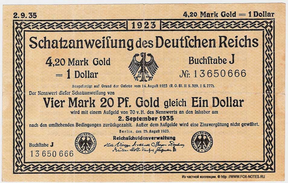 Reichsschuldenverwaltung. Schatzanweisungen des Deutschen Reiches. 4,20 Mark Gold = 1 Dollar. 25. August 1923. Reiche 3. (Treasury obligation 4.20 marks in gold 1923)
