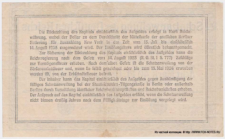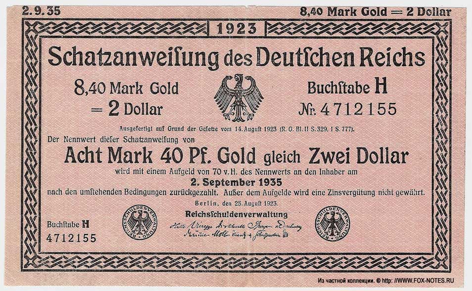 Reichsschuldenverwaltung. Schatzanweisungen des Deutschen Reiches. 8,40 Mark Gold = 2 Dollar. 25. August 1923. Reiche 3. (Treasury obligation of 8.40 marks in gold 1923)